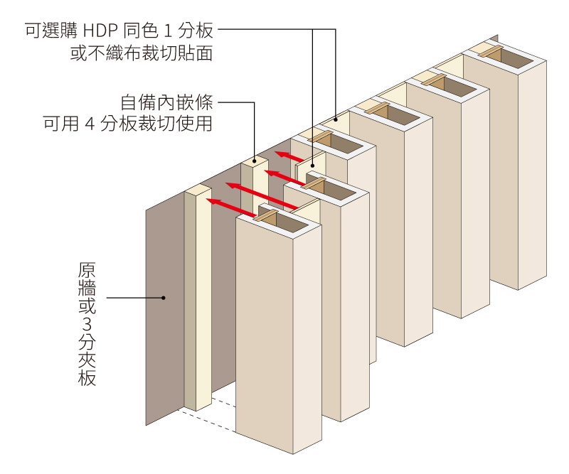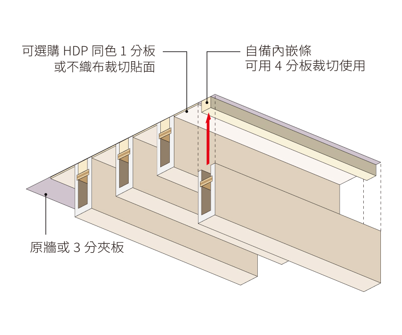 HDP訂製格柵搭配同色或跳色的HDP寫真板,可選1分板或不織布貼於底材。格柵固定於自備的4分內嵌條,請勿從表現打釘固定,會造成表現花色破損。此施工方式須使用腳高1.2cm的HDP訂製格柵。