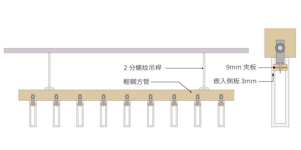 以 2 分螺紋吊桿懸掛,結合輕鋼方管作為主骨架,此施工方式須使用腳高0.1cm的HDP訂製格柵。
