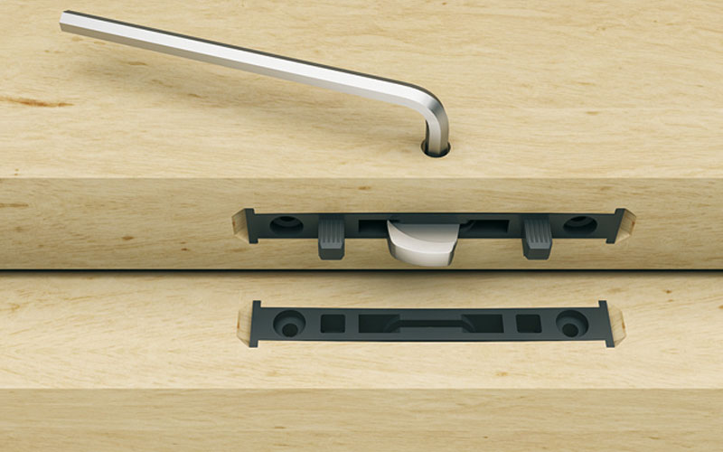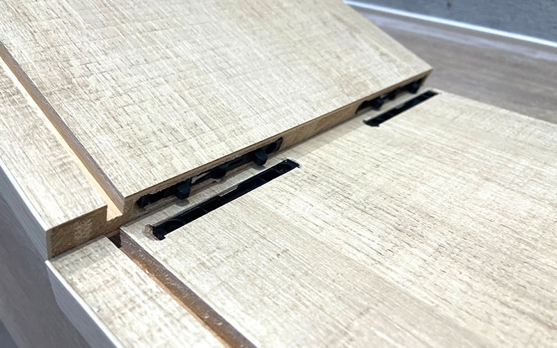 木芯板可搭配「拉米諾連結系統」,讓連接五金隱藏於板材內部,減少外露螺絲孔,讓整體視覺更簡潔俐落,現場組裝也更快速,降低施作繁複度。